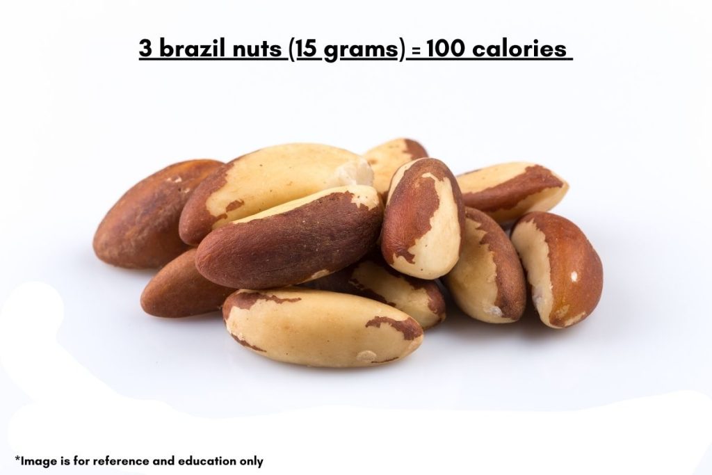 A mere 3 brazil nuts — roughly 15 grams — is all it takes to hit 100 calories, which makes for a striking visual when placed next to a pile of pistachios. They’re one of the richest dietary sources of selenium on the planet, meaning just a couple a day is genuinely enough.